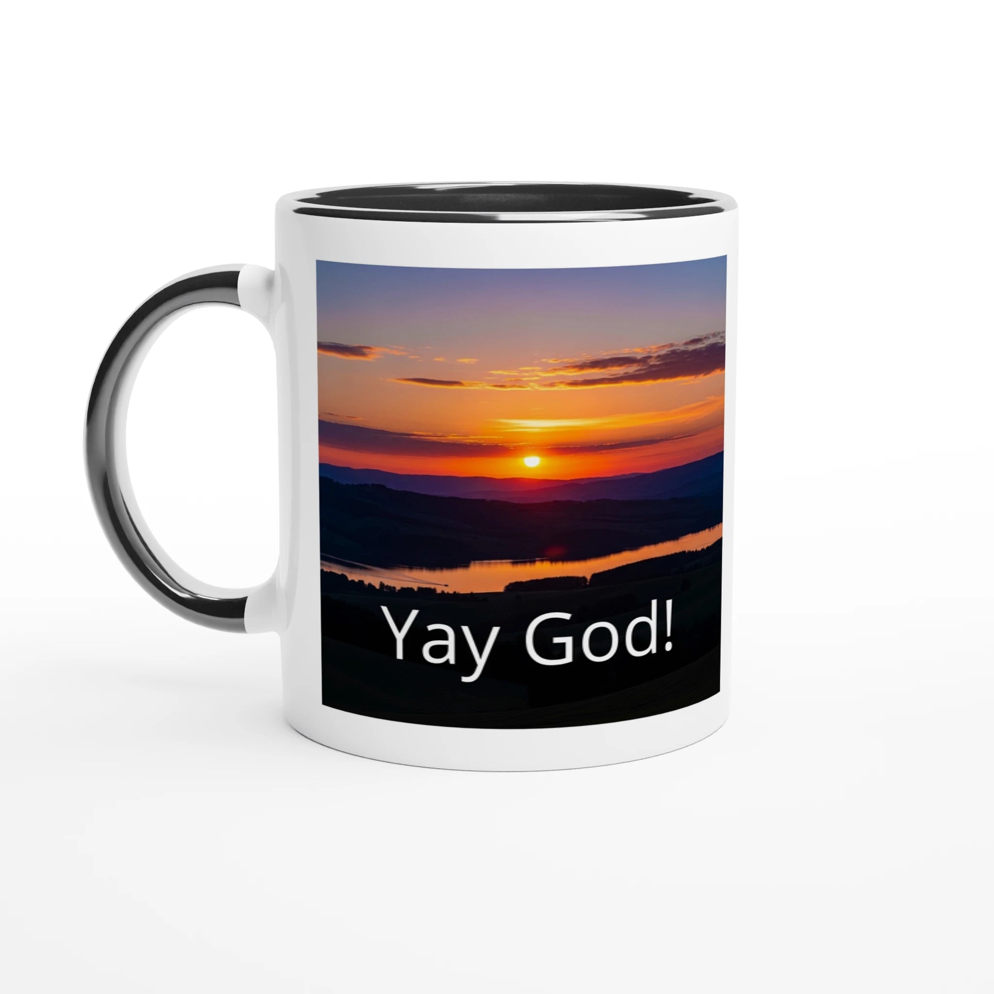 Celebrate our Lord and Savior while journaling, praying, ANYthing! A beautiful reminder that He's the creator of all. Your morning coffee, a hot chocolate, or any other hot beverage you enjoy. The mug is glossy white with a black rim, inside, and black handle. The prints come out beautifully and vividly on it. The print retains its quality and luster when used in both microwaves and the dishwasher.